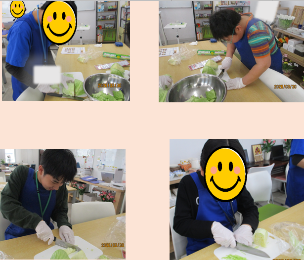 キャベツを切る場面では、千切りのように細かく丁寧に切る子や、手でちぎったり大きめにカットする子もいて、一人ひとりの個性が感じられる微笑ましい時間となりました😊